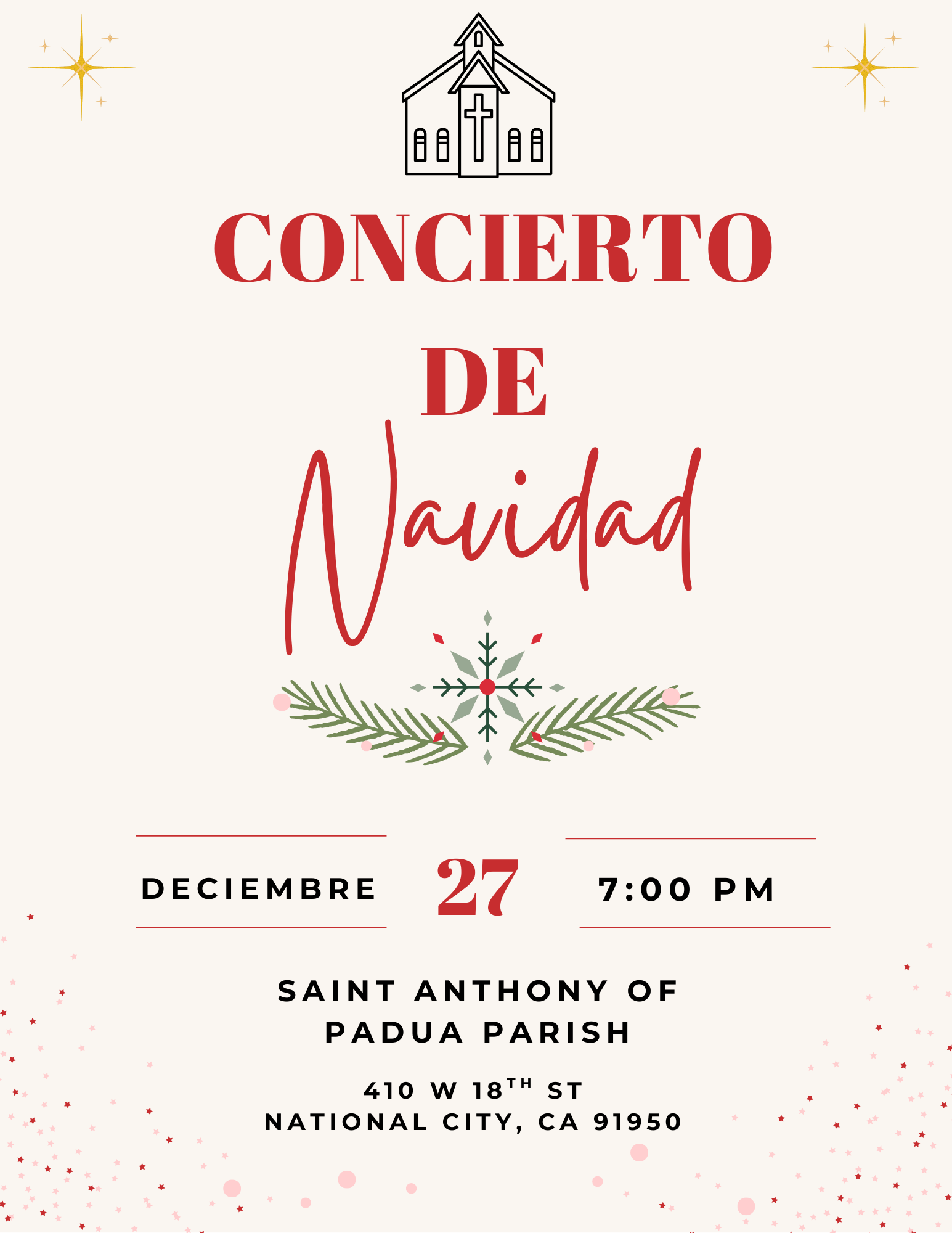 Concierto de Navidad + Add to Google Calendar + iCal / Outlook export Date Dec 27 2025 Expired! Time 7:00 PM - 8:00 PM Location Saint Anthony of Padua National City 410 W 18th St, National City, CA 91950 Opening Hour 8-12pm - 2pm-5pm Website https://saintanthonyofpaduanc.org/ Phone (619) 707 9995 Share this event