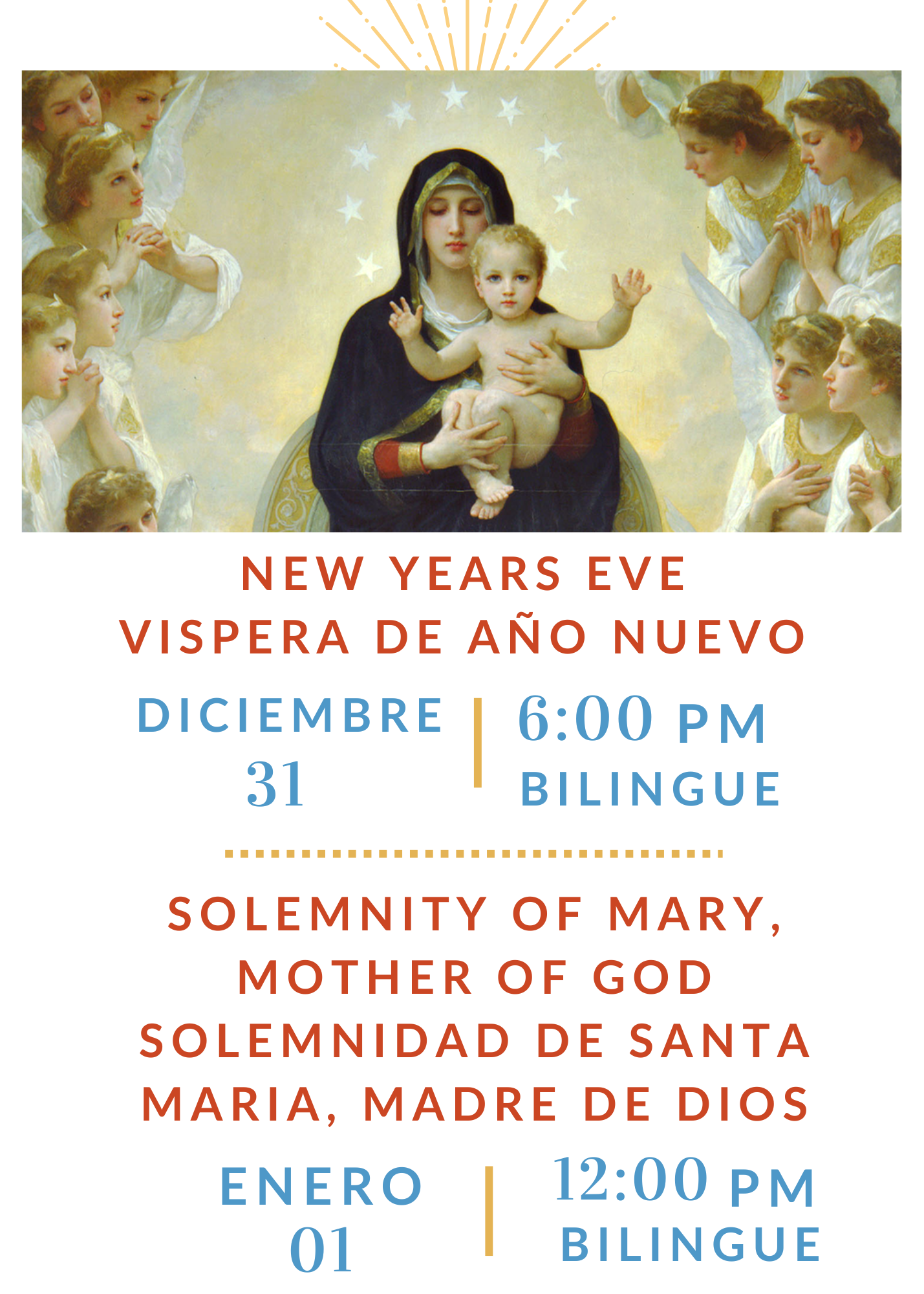 Solemnidad de María, Madre de Dios + Add to Google Calendar + iCal / Outlook export 00 days 00 hours 00 minutes 00 seconds Date Dec 31 2025 - Jan 01 2026 Time 6:00 PM - 12:00 PM Location Saint Anthony of Padua National City 410 W 18th St, National City, CA 91950 Opening Hour 8-12pm - 2pm-5pm Website https://saintanthonyofpaduanc.org/ Phone (619) 707 9995 Share this event
