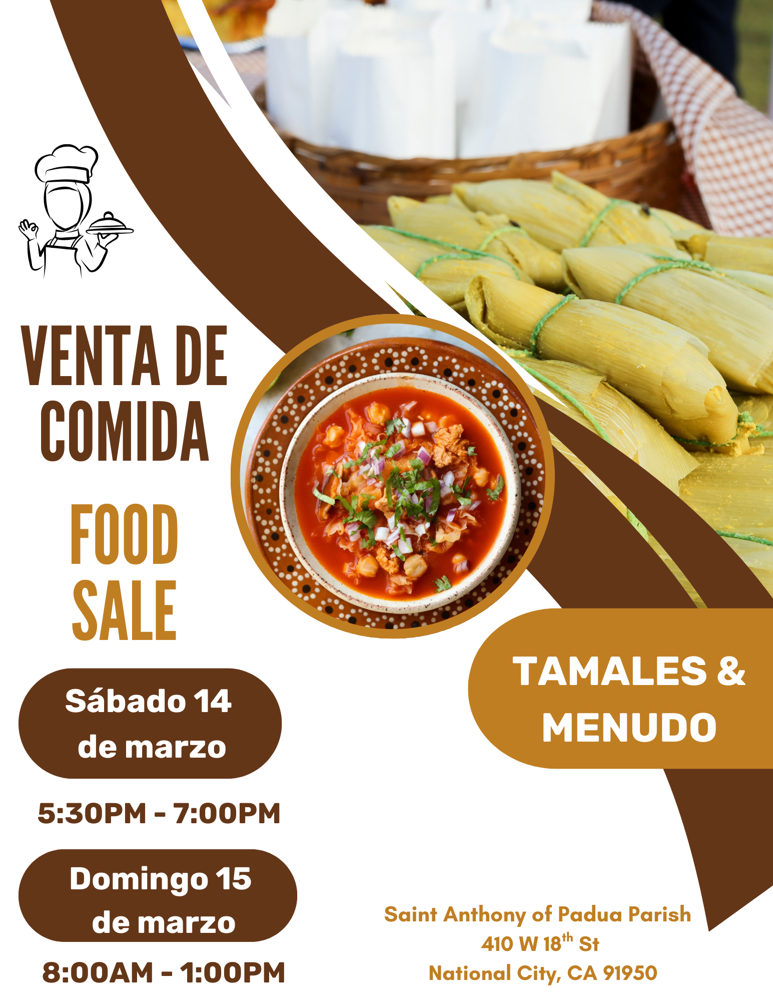 Venta de Comida/Food Sale + Add to Google Calendar + iCal / Outlook export 00 days 00 hours 00 minutes 00 seconds Date Mar 14 2026 Time 4:30 PM - 7:00 PM Location Saint Anthony of Padua National City 410 W 18th St, National City, CA 91950 Opening Hour 8-12pm - 2pm-5pm Website https://saintanthonyofpaduanc.org/ Phone (619) 707 9995 Share this event