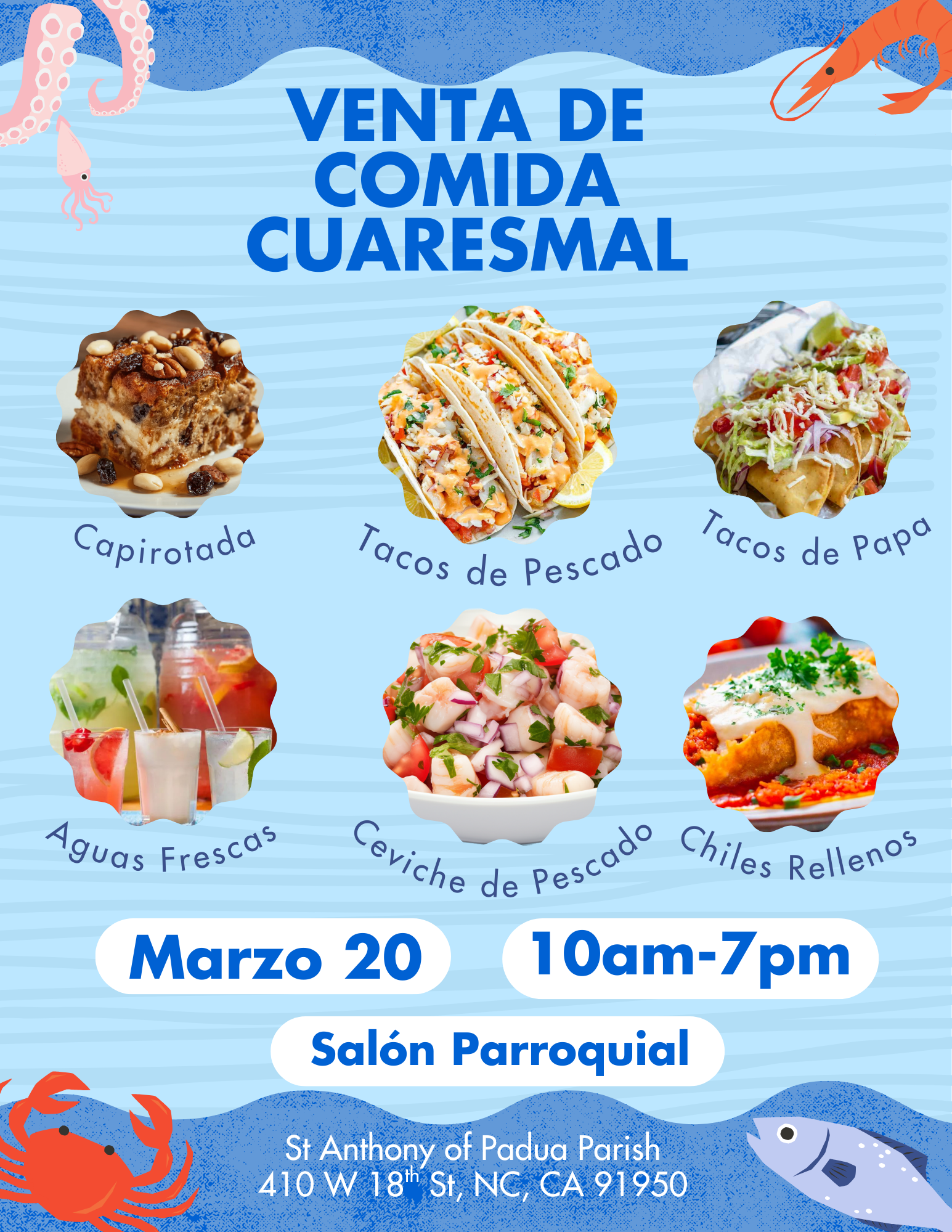 Venta de Comida/Food Sale + Add to Google Calendar + iCal / Outlook export Date Mar 20 2026 Expired! Time 10:00 AM - 7:00 PM Location Saint Anthony of Padua National City 410 W 18th St, National City, CA 91950 Opening Hour 8-12pm - 2pm-5pm Website https://saintanthonyofpaduanc.org/ Phone (619) 707 9995 Share this event