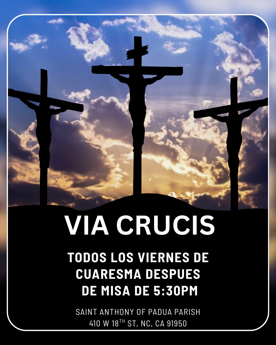 Via Crucis + Add to Google Calendar + iCal / Outlook export 00 days 00 hours 00 minutes 00 seconds Date Mar 13 2026 Time 6:00 PM - 6:45 PM Location Saint Anthony of Padua National City 410 W 18th St, National City, CA 91950 Opening Hour 8-12pm - 2pm-5pm Website https://saintanthonyofpaduanc.org/ Phone (619) 707 9995 Share this event